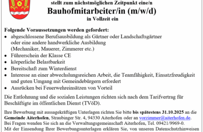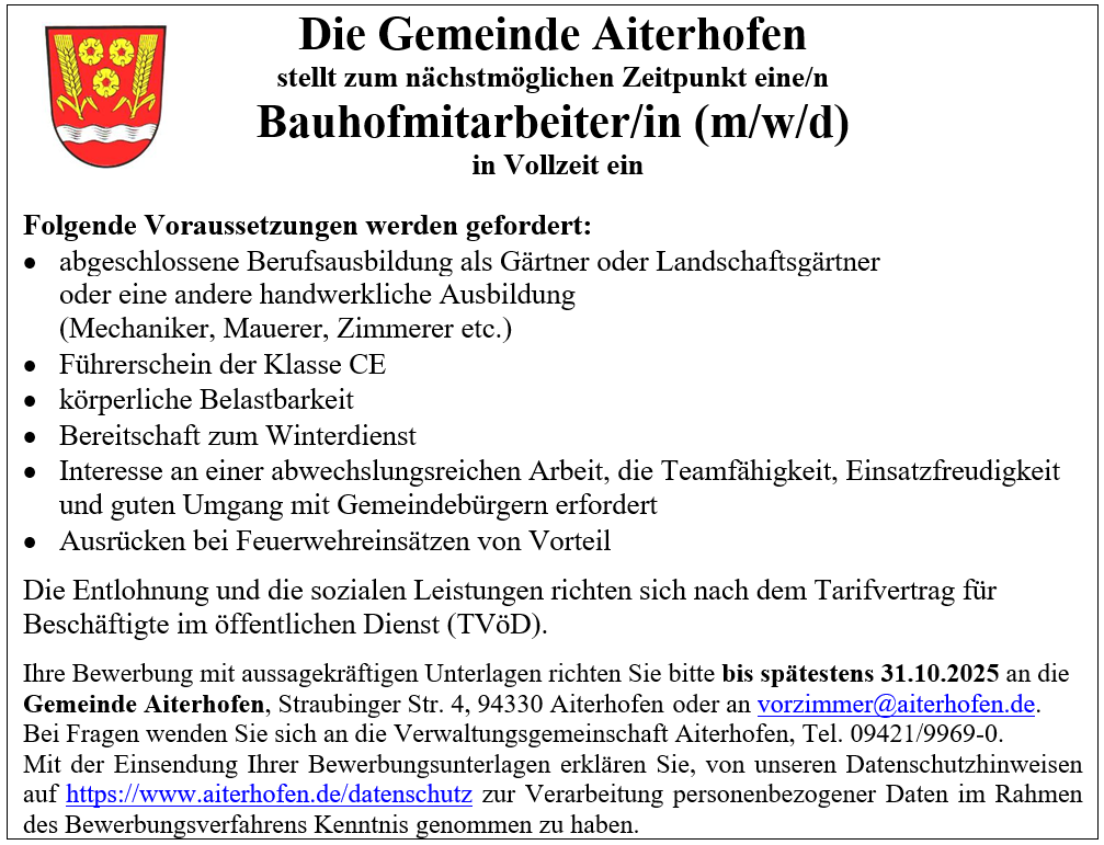 Aktuelles aus Aiterhofen Bauhofmitarbeiter (m/w/d) gesucht weiterlesen ILE Senioren trafen sich zum Kegeln Mittlerweile schon traditionell hat die Gemeinde Oberschneiding am Donnerstag, den 18. September 2025 für die Senioren der ILE Gäuboden beim… weiterlesen Gemeinderatsbericht vom 23.09.2025 Einbruch in die Grundschule – Förderprogramm „Natürlicher Klimaschutz in Kommunen“ In der Gemeinderatssitzung am letzten Dienstag unter dem Vorsitz von… weiterlesen Abschluss der Sanierungsarbeiten an der historischen Friedhofsmauer in Aiterhofen Unter Bauherrschaft des Staatlichen Bauamtes Passau, Abteilung Hochbau, wurden in diesem Jahr die Arbeiten zur Sanierung der Friedhofsmauer in Aiterhofen,… weiterlesen Fördermitglieder Haustürwerbung des BRK Kreisverband Straubing-Bogen In den kommenden Wochen führt die vom BRK-Kreisverband Straubing-Bogen beauftragte Firma Kober GmbH in der Stadt Straubing sowie im Landkreis… weiterlesen OGV spendet an Kita Maria Schutz Mit einer Spende in Höhe von 350,– € hat Sonja Koller-Reith, Vorsitzende des Obst- und Gartenbauvereines Aiterhofen, vor kurzem das… weiterlesen Mehr Aktuelles