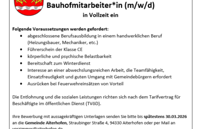 Gemeinderatssitzung vom 27.01.2026 Bauvorhaben behandelt Zur ersten Sitzung im neuen Jahr traf sich der Gemeinderat der Gemeinde Aiterhofen unter Leitung von Bürgermeister Adalbert… weiterlesen