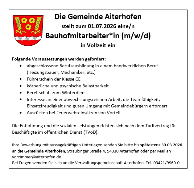 Aktuelles aus Aiterhofen Gemeinde Aiterhofen sucht Bauhofmitarbeiter weiterlesen Psychose-Seminar am 05.03.26 zum Thema „Psychose und Cannabis“ der PSAG des Gesundheitsamtes Straubing-Bogen weiterlesen ILE Gäuboden bietet erneut Regionalbudget an Zwischenaufruf anlässlich des Regionalbudgets 2026 für Kleinprojekte in den Gemeinden Aiterhofen, Feldkirchen, Irlbach, Leiblfing, Oberschneiding, Salching, Straßkirchen Bis 28. Februar… weiterlesen VHS Außenstelle Aiterhofen sehr erfolgreich Zu einem erfreulichen Anlass trafen sich Bürgermeister Adalbert Hösl, der Geschäftsführer der VHS Straubing-Bogen, Robert Dollmann, Mitglied des Aufsichtsrates Alfons… weiterlesen ILE-Senioren: Polizeivortrag informiert über Betrugsmaschen Großes Interesse zeigte sich beim Informationsvortrag der Polizei zum Thema Betrugsmaschen wie Enkeltrick, Schockanrufe und weitere Formen des Telefon- und… weiterlesen Gemeinderatssitzung vom 27.01.2026 Bauvorhaben behandelt Zur ersten Sitzung im neuen Jahr traf sich der Gemeinderat der Gemeinde Aiterhofen unter Leitung von Bürgermeister Adalbert… weiterlesen Mehr Aktuelles