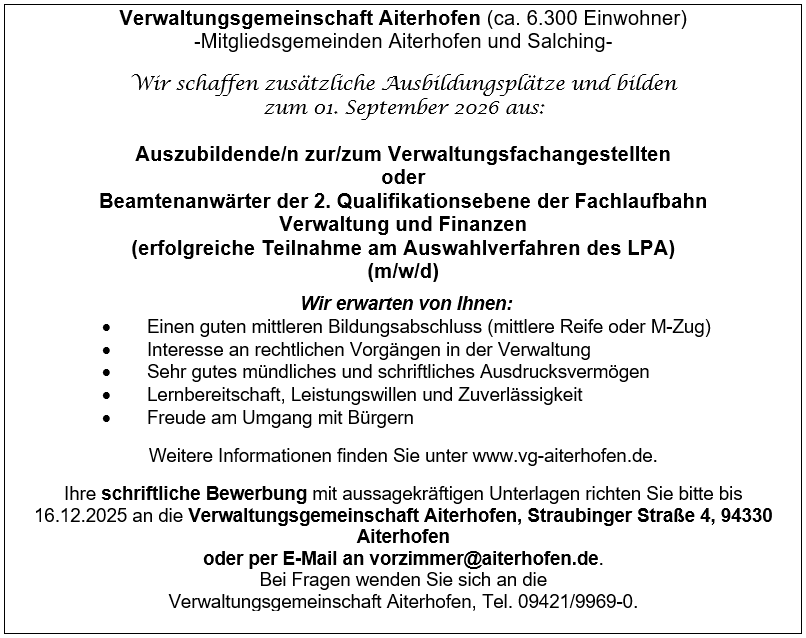 Ihre schriftliche Bewerbung mit aussagekräftigen Unterlagen richten Sie bitte bis 16.12.2025 an die Verwaltungsgemeinschaft Aiterhofen, Straubinger Straße 4, 94330 Aiterhofen