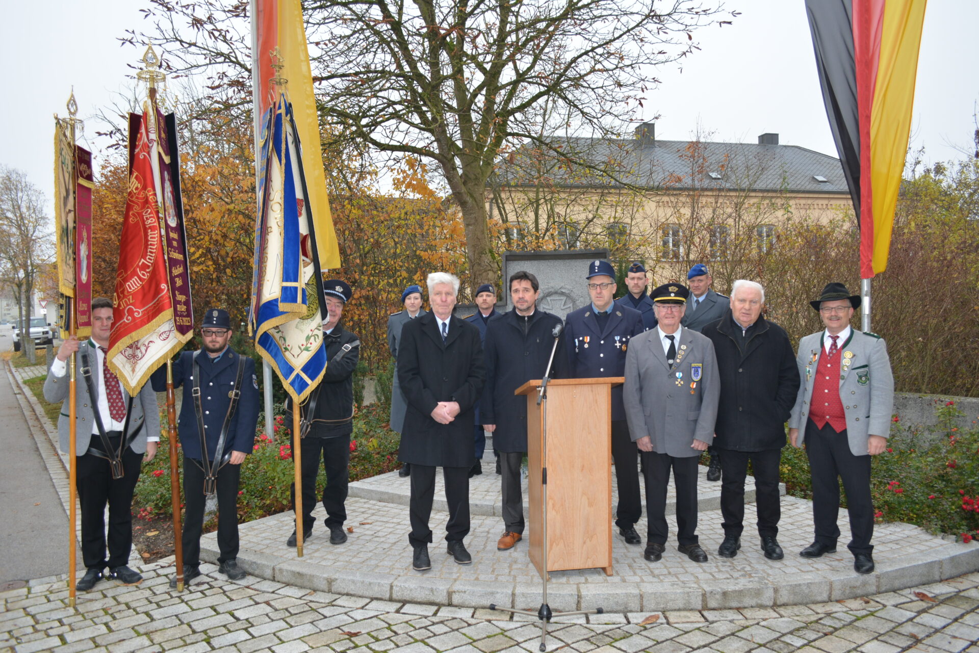 Foto: Vereine mit Fahnenabordnungen sowie Vertreter der Öffentlichkeit und eine Ehrenwache der Bundeswehr am Kriegerdenkmal in Geltolfing